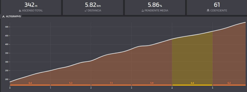 Parte desde los 185 m y alcanza los 526 m de altitud. En poco más de cinco kilómetros acumula más de 340 metros de desnivel, lo que lo convierte en un reto perfecto para ciclistas con buena fuerza en escalada.