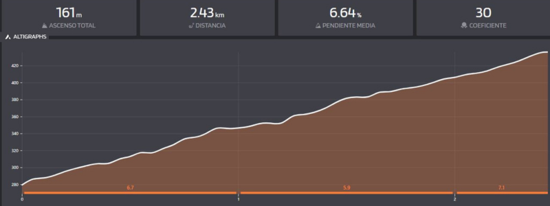 Desde los 279 m hasta los 436 m, este puerto gana 161 metros de altitud de forma directa, convirtiéndolo en un esfuerzo breve pero intenso.